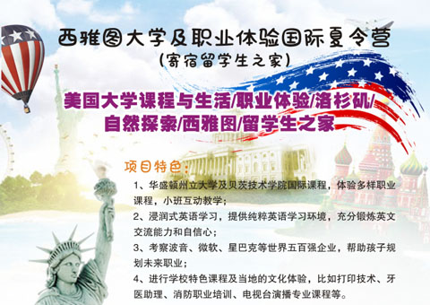 安妮莱特学校官方国际课程夏令营 (寄宿学生公寓)项目关键词 安妮莱特高中/ESL/机器人/艺术/自然探索/西雅图/学生公寓/项目成效与收获 详情点击安妮夏令营.pdf 西雅图大学及职业体验国际夏令营 (寄宿留学生之家) 项目关键词 美国大学课程与生活/职业体验/洛杉矶/自然探索/西雅图/留学生之家 详情点击西雅图夏令营.pdf