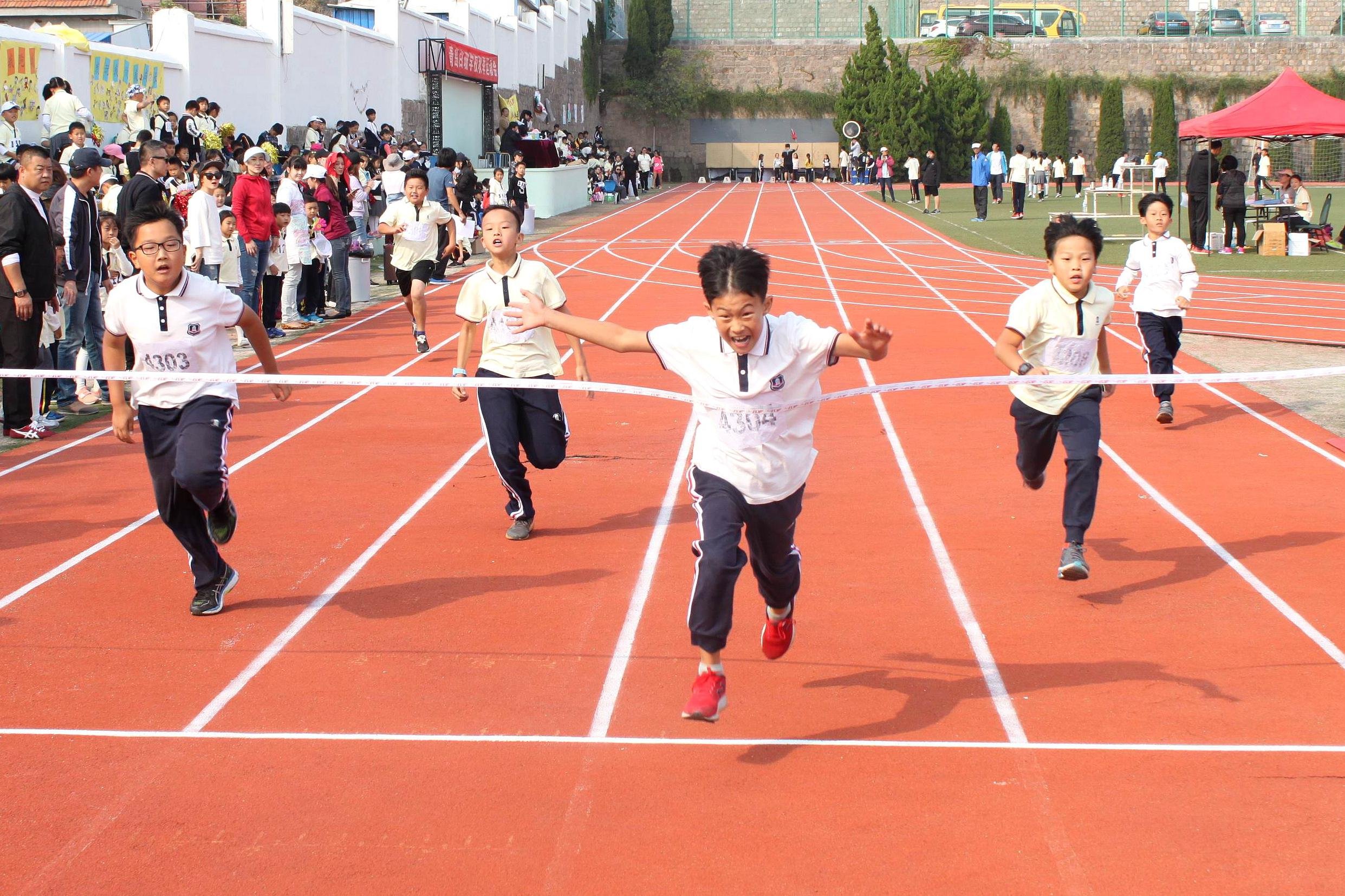 我们高声齐唱国歌,五星红旗冉冉升起。于校长对本次运动会提出了希望,运动员代表郑重宣誓。 看台上,孩子们贴出了本班精心制作的加油海报,挥舞手中的彩球,为本班的运动健儿加油鼓劲!作为志愿者的家长自带战鼓,为这些小小健儿擂鼓助威。 运动员们卯足了劲,拼尽全部的汗水,只为胜利的荣光!向终点冲啊!餐厅的师傅们上午为师生们提供姜枣茶;中午特地做了香喷喷的肉包子,为运动员们补充能量。下午,教工运动项目掀起了全场的高潮,学生们一看到自己的老师上场了,顿时沸腾起来,纷纷摇旗呐喊为自己的老师加油。老师们也不负众望,拿出了自己最好的水平,箭离了弦般飞向终点。另一侧,跳高、跳远、垒球场地上也在同时如火如荼的进行着,同学们摩拳擦掌,跃跃欲试,低头深吸一口气,抬头奔跑直到在空中划出一道漂亮的抛物线,一次又一次的尝试着,想要看看自己的极限究竟在哪里!时间飞逝,太阳从东边滑到西边,一天的运动会就要结束了。孩子们顶着红扑扑的小脸,兴奋地和小伙伴们分享着自己的成功。“瞧!这就是我们的奖状!”经过自己努力和汗水得来的成就总是最甜的。在本次运动会中,孩子们检阅了自己平日的运动成果,展示了自己意气风发的勃勃青春,以及最不服输的劲头儿,这种拼劲儿正是白珊的孩子们刻在骨子里头的骄傲!作为白珊的孩子,幸福着,骄傲着,拼搏着!无论在学习中,还是运动会上,我们总是要做最棒的!